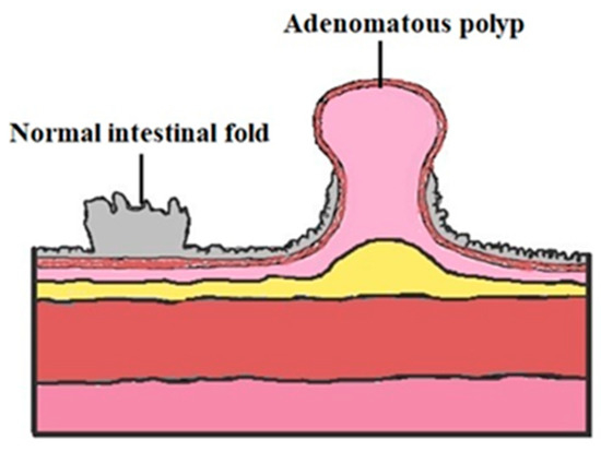 In Dorland‘s Illustrated Medical Dictionary, a “morbid excrescence” is the definition given to the polyp. Polyps are related to adenomatous polyps because of the progress of their pathology and microscopic histology [31]. Adenomatous polyps are divided in three groups: tubular, villous, and tubule–villous (a mixture of both growth patterns). These groups depend on the grade of dysplasia, the existence of the adenocarcinoma in adenoma, and the type of histology.