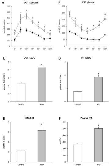 Impact of high-fat diet (HFD) consumption on plasma glucose and plasma fatty acid concentration. Panel A—plasma glucose profile during oral glucose tolerance test (OGTT); Panel B—plasma glucose profile during intraperitoneal insulin tolerance test (IPTT); Panel C—area under the plasma glucose curve for OGTT; Panel D—area under the plasma glucose curve for IPTT; Panel E—HOMA-IR value; Panel F—plasma free fatty acids (FFA). Values are mean ± SD (n = 8 per group); a —p < 0.05 vs. control; significance by t-test; HFD-High-fat diet.