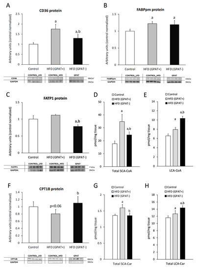 The FATP1 content in skeletal muscle significantly decreased in HFD(-GPAT) muscle, as compared to both the control and HFD(+GPAT) muscle (p < 0.05). Although the FATP1 content slightly increased in the HFD(+GPAT) group, this change did not reach statistical significance (Figure 2C).