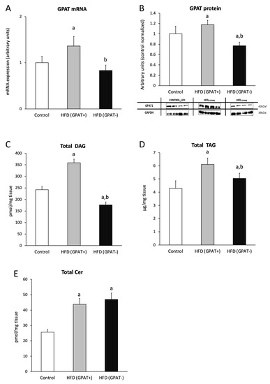 The impact of skeletal muscle GPAT silencing on the gene and protein expression of GPAT, and the content of bioactive lipids in gastrocnemious muscle of high-fat diet mice. Panel A and B—the expression skeletal muscle GPAT at the mRNA and protein level, respectively; Panel C—total content of diacylglycerols (DAG); Panel D—total content of triacylglycerols (TAG); Panel E—total content of ceramide (Cer). Values are mean ± SD (n = 8); a—p < 0.05 vs. control; b—p < 0.05 vs. HFD(GPAT+); significance by ANOVA; HFD—high-fat diet. * The observed molecular weight of indicated proteins is different to the theoretical one, as stated by the antibody manufacturer.
