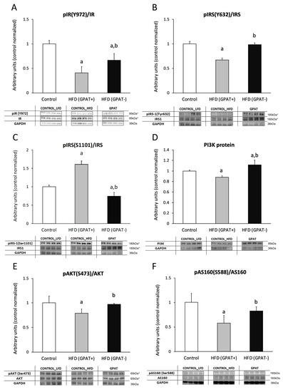 Activation of insulin signaling pathways in GPAT-silenced mouse gastrocnemious muscle. Panel A—insulin receptor phosphorylation (pIR Y972); Panel B—insulin receptor substrate 1 (IRS1) tyrosine phosphorylation (pIRS1 Y632); Panel C—IRS1 serine phosphorylation (pIRS S1101). Panel D—protein expression of phosphoinositide 3-kinase (PI3K); Panel E—serine phosphorylation of protein kinase B/Akt (pAKT S473); Panel F—serine phosphorylation of Akt/PKB 160kDa substrate (pAS160 S588). Values are mean ± SD (n = 8); a—p < 0.05 vs. control; b—p < 0.05 vs. HFD(GPAT+): statistics by ANOVA; HFD—high-fat diet. * The observed molecular weight of indicated proteins is different to the theoretical one, as stated by the antibody manufacturer.