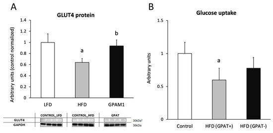 The impact of GPAT silencing on mouse gastrocnemious muscle insulin-stimulated glucose uptake. Panel A—protein expression of glucotransporter 4 (GLUT4); Panel B—insulin-stimulated glucose uptake. Values are mean ± SD (n = 8); a—p < 0.05 vs. control; b—p < 0.05 vs. HFD(GPAT+); significance by ANOVA; HFD- high-fat diet. * The observed molecular weight of indicated proteins is different to the theoretical one, as stated by the antibody manufacturer.