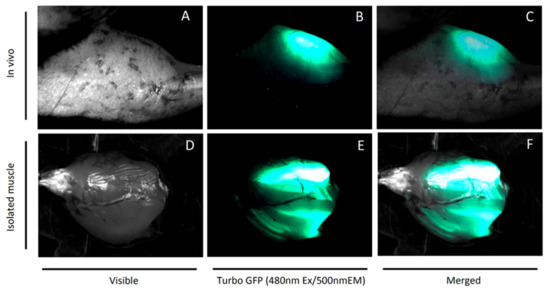Green fluorescent protein (TurboGFP) reporter gene expression in mouse muscle at 6 weeks after electroporation-mediated plasmid transfection. Panel A—visible light photo of mouse hindlimb; Panel B—transcutaneous Turbo-GFP fluorescence of electroporated gastrocnemius and tibialis anterior muscle; Panel C–A and B merged; Panel D—visible light photo of isolated mouse gastrocnemius muscle; Panel E—Turbo-GFP fluorescence of electroporated gastrocnemius; Panel F–D and E merged. Fluorescence stereomicroscopy performed with Nightsea SFA-RB-GO fluorescence adapter/DeltaPix Invenio 5SIII CMOS camera.