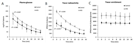 Exemplary plasma glucose concentration and 2-deoxy-[1,2-3H (N)]-d-glucose radioactivity curves after bolus injection of the tracer and insulin are presented in Figure 7.