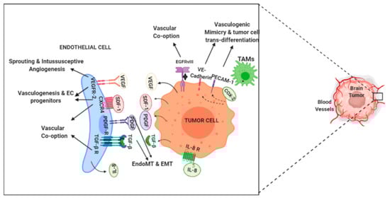When it comes to the molecular players driving vascular co-option in brain tumors, most of the studies have focused on glioblastoma so far; some experimental evidence in medulloblastoma also exists. In glioblastoma, important molecular modulators include: (a) bradykinin (which belongs to the kinin family), which is secreted by EC and induces chemotaxis of the glioblastoma cells; (b) the SDF1/CXCR4 chemoattractant system which was described earlier in the vasculogenesis section; (c) interleukin (IL)-8 secreted by the EC; (d) mutated versions of epidermal growth factor receptor (EGFR) expressed in glioblastoma cells such as the EGFRvIII, which contributes to excessive angiogenesis; (e) the factor MDGI (mammary-derived growth inhibitor), which plays a key role in maintaining lysosomal membrane stability and is overexpressed in both glioblastoma cells and the EC; and (f) EphrinB2, which is of EC origin and plays a fundamental role in cell-to-cell communication [74,75,76,77,78,79]. Blockade of or interference with the above-mentioned pathways has been shown to successfully reduce the levels of vascular co-option in glioblastoma animal models. Further studying of the molecular mechanisms involved in vascular co-option in glioblastoma is of great clinical importance since some of these pathways can be pharmacologically inhibited by drugs that are already approved for clinical use, and vascular co-option seems to be one of the major mechanisms used by the glioblastoma cells for escaping antiangiogenic therapy [66,76].