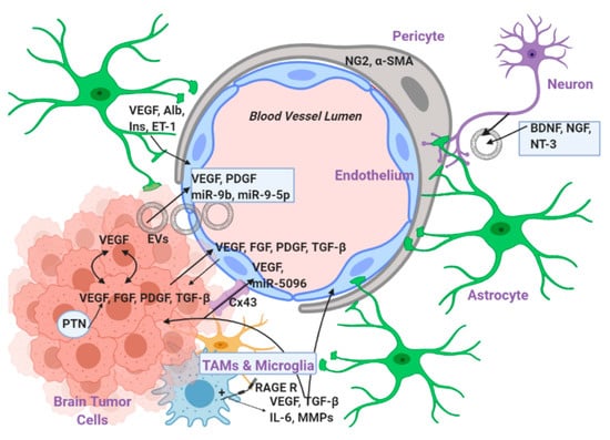 Levels of interaction between the endothelial and the tumor cells. The interaction happens on three different levels: (a) secreted factors, (b) gap junctions, and (c) intermediate cells. The secreted factors are derived either from the tumor or the endothelial cells and there is a reciprocal relationship between them. (a) Brain tumor cells produce and secrete VEGF, FGF, PDGF, and TGF-β that act upon the endothelial cells and induce angiogenesis with mechanisms discussed in Section 2. Moreover, the tumor cells secrete extracellular vesicles (EVs) that contain secreted protein factors and microRNAs that are also positively correlated with the induction of angiogenesis. Note also that there is a positive feedback loop mechanism between pleiotrophin (PTN) and VEGF production on the tumor cells. (b) There is also direct interaction between the tumor and endothelial cells in the brain via connexins such Cx43. Cx43 facilitates the transportation of microRNAs and proteins like VEGF from the tumor to the endothelial cells and therefore is directly involved in the induction of angiogenesis. (c) Many types of surrounding intermediate cells also play a crucial role in the communication between the endothelial and the tumor cells. Pericytes promote vascular maturation by expressing NG2 and α-SMA. It is important to note that the interaction between the pericytes and the endothelial cells contributes to the formation of junctions between the endothelial cells and triggers signaling that leads to the recruitment of either resident or peripheral immune cells, which can also support angiogenesis (see discussion about TAMs below). Astrocytes secrete factors that promote and support angiogenesis and vessels growth such as VEGF, albumin (Alb), insulin (Ins) and endothelin-1 (ET-1). Additionally, the resident microglia and the tumor associated macrophages (TAMs) which reside locally and have an M2 tumor-promoting phenotype play a very important role in supporting tumorigenesis and angiogenesis via their receptor RAGE1, whose activation triggers the secretion of VEGF, matrix metalloproteinases (MMPs), TGF-β, and IL-6. Finally, the surrounding tumor neurons seem to also affect the endothelial–tumor cell interaction since they secrete factors such as BDNF, NGF, and NT3 which are all not only angiogenic but also facilitate endothelial cell survival and vessel stabilization.