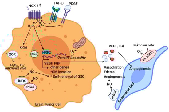 Summary of the ROS and NO producing systems expressed in the tumor and endothelial cell respective and their role in tumorigenesis and angiogenesis. The main ROS producing systems in the tumor cells are the NADPH oxidases and especially NOX4, the enzyme XOR, and the mitochondria. NOX4 activation is positively correlated with the induction of tumorigenic and angiogenic mechanisms. In particular, secreted factors acting on the tumor cells such as TGF-β and PDGF activate NOX4, which in turn produces high amounts of ROS such as H2O2 and O2-. These ROS alter the downstream signaling in a way that promotes the expression of pro-angiogenic genes such as VEGF and FGF, which are then secreted and act on the endothelial cells. Moreover, NOX4-derived ROS induce the expression of other genes involved in glioblastoma invasion or in processes such as the self-renewal of glioblastoma stem cells (GSC). Note that in all these processes, the activation of the transcription factor Nrf-2 plays a key role. Mitochondria can produce large amount of ROS that can lead to genetic instability and inflammation which can facilitate the dedifferentiation of astrocytes to astrocytoma cells and increase their tumorigenic potential. However, the mitochondrial-derived ROS can play also opposing roles and facilitate the apoptotic cell death of tumor cells. The main NO is βeNOS, which is among the master regulators of the vascular tone (inducing vasodilation). iNOS-derived NO can trigger the self-renewal of GSC, whereas NO from other sources (i.e., nNOS and eNOS) has been positively correlated to phenomena such as vasodilation, edema, and angiogenesis. Finally, it is important to mention that the phenomenon of eNOS uncoupling (un. eNOS), when eNOS switches activity from a NO to a ROS producing enzyme, has not been studied at all in the context of brain tumors.
