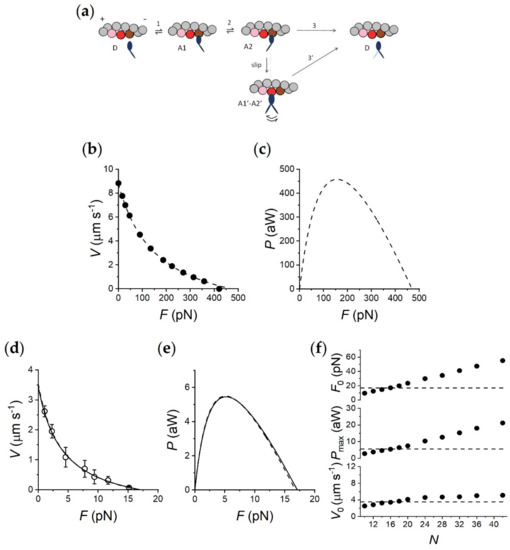 Under these conditions, the model is able to fit all the features of the F-V and P-F relations of the myosin-based nanomachine (continuous lines in Figure 3d,e, respectively), using as the only free parameter the number of motors available for the actin interaction (N), which must be scaled down from that in the half-thick filament, 294 [29], to that in the nanomachine, 16, in the experiments under consideration [10]. This is shown in detail in Figure 3f, in which the horizontal dashed lines, representing the experimental values for F0 (16.79 ± 0.38 pN), Pmax (5.45 aW) and V0 (3.54 ± 0.13 µm s−1), intersect the relations between the corresponding simulated parameters and N (dots) for N = 16. The value of 16 is twice the number of rupture events recorded from the ensemble of motors deposited on the same support in ATP-free (rigor) conditions (see figure 1 in [10]). Assuming that each motor of the myosin dimers identified as available for actin interaction by rupture events in rigor behaves independently in 2 mM ATP, eight rupture events in rigor imply N = 16, in agreement with the prediction of the model simulation. It is worth noting that the model predicts that F0 and Pmax rise continuously with N, while V0 attains a plateau for N ≥ 24. In fact, according to the AF Huxley 57 model [20], V0, the unloaded shortening velocity, is attained at a velocity at which a balance is attained between motors undergoing the working stroke and promoting sliding and motors at the end of the working stroke and resisting sliding. Therefore, this V0 is intrinsically independent of the number of available motors and solely dependent on the rate constant for motor detachment. The simulation predicts that this condition is no longer realized if N is <24, suggesting that below a given number of motors in the ensemble, the reduction of the duty ratio with the increase in shortening velocity reduces the number of motors attached at any time to less than three, and there is a consequent loss of the conditions for continuous interaction [30] which appears as a reduction in the average sliding velocity [10].