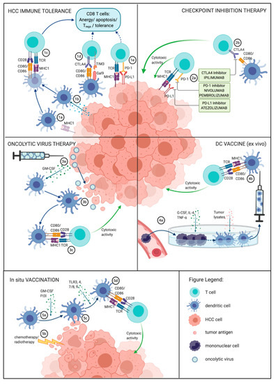The realization that poorly immunogenic tumors do not respond sufficiently to checkpoint inhibition prompted the approach of inducing an endogenous antitumor response before the checkpoint blockade. As such, studies conducted in poorly immunogenic melanoma more than two decades ago showed that, while the tumors did not respond to anti-CTLA4, a combination with a GM-CSF-transduced cellular vaccine induced a tumor response [149]. Combinations of in situ vaccines with subsequent checkpoint inhibition has shown promising effects in other tumor entities [150], but its efficacy remains to be evaluated in HCC.