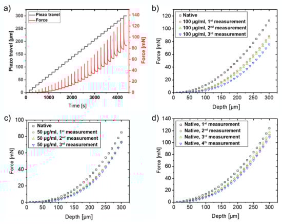 Typical force data of a stepwise indentation procedure are depicted in Figure 2a. After each step, a partial stress-relaxation is observed. Here, the last value of each relaxation curve, just before the next piezo step (equilibrium force), was picked and plotted against the indentation depth to obtain force-indentation curves, which are shown in Figure 2b–d.