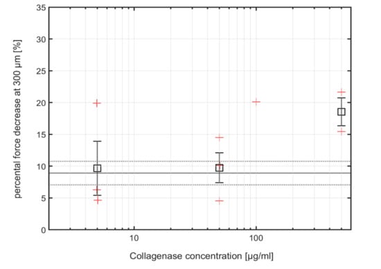In general, at indentation depths between 100 and 300 µm, all indentation curves measured on a sample before the digestion showed higher force values and a faster ascending trend than the curves measured on the same sample after digestion. Due to the variability of the cartilage between individual animals as well as along the condyle surface of the same animal, the absolute force value at 300 µm indentation was quite variable from sample to sample. Therefore, we adopted the relative difference of the force at 300 µm indentation between the native and digested condition of each sample, i.e., the force difference divided by the force value measured at 300 µm on the native sample, as an indicator of cartilage degeneration. Figure 3 shows the relative differences of the forces (in percent) for the individual cartilage samples (red crosses) between the native state compared to the first measurement after digestion, as well as the mean values (black squares) and standard errors (black bars) for the different collagenase concentrations. The grey lines in Figure 3 indicate the relative differences obtained between repeated measurements on untreated samples (8.8% ± 1.9%, mean (solid) and standard error (dotted)) and thus represents the current sensitivity limit of our method. At a collagenase concentration of 5 and 50 µg/mL, the mean of the relative differences obtained on treated and untreated samples is only 9.67% ± 4.26% and 9.74% ± 2.35%, and thus below this sensitivity limit. This is also reflected by p-values 0.87, and 0.79 of a one-way unbalanced ANOVA test against native sample variation for 5, and 50 µg/mL, respectively. At a collagenase concentration of 500 µg/mL, however, the relative change of 18.54% ± 2.19% is well above the sensitivity limit of our sensor, indicating that the FBG microindenter is capable of detecting the stiffness decrease induced by 500 µg/mL collagenase treatment. Here, the p-value of the ANOVA test reaches 0.06, which is very close to the commonly applied 0.05 threshold of statistical significance, and which could probably be further reduced by recording more data points.