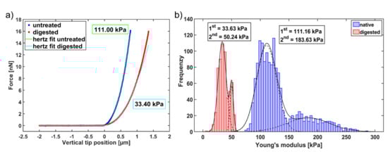 For the statistical analysis of the obtained Young’s modulus values, the results of the three maps of each sample and degradation stage were merged into a stiffness distribution (histogram). The data analysis was carried out with the JPK data processing software (version 5.0.130) follows the method described by Prein et al. (2016) [27].