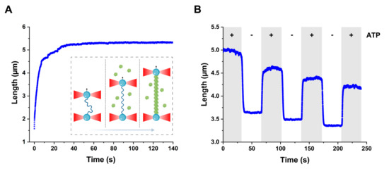 Dynamics of DrRecA–ssDNA filaments length. (A) DrRecA binding leads to ssDNA elongation under the stretching force of 12 pN (Inset: schematic representation of the experimental scheme. A DNA tether is stretched with a controlled force by adjusting the distance between the beads using dual-trap optical tweezers). (B) DrRecA–ssDNA filaments reversibly switch between stretched and compressed conformations depending on the presence of ATP, which is characterized by dynamic change of the filaments length at stretching force of 2 pN in the ATP-containing buffer (gray sections) and ATP-free buffer (white sections). DrRecA: a central enzyme of recombinational DNA repair; ssDNA: single-stranded trails.