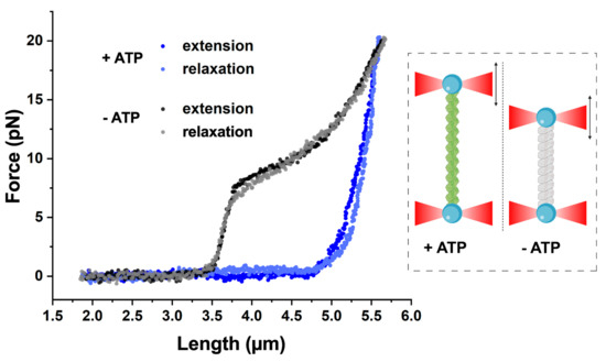 The compressed state of the DrRecA–ssDNA filament exhibits intrinsic force–extension behavior (Figure 2). Upon stretching, the initial rise in force occurs at a lower end-to-end distance compared to that of the extended ATP-bound state. However, at forces higher than 7.9 ± 0.7 pN (N = 9), a sharp change in the slope of the force–extension curve is observed, which is characterized by the significantly enhanced extensibility of the tether. An abrupt transition at similar stretching forces has been previously reported for the inactive form of EcRecA–ssDNA filaments [34,46]. However, unlike the constant force plateau around 8 pN measured for EcRecA–ssDNA filaments in the presence of ADP [46], the stretching of inactive DrRecA–ssDNA filaments at forces higher than 8 pN resulted in a continuous force increase, approaching a force–extension behavior of bare ssDNA (Figure S2) similar to [34]. Although the nature of such a force-induced transition cannot be resolved solely based on force–extension analysis, extension and relaxation of the inactive DrRecA–ssDNA filament follow almost identical curves, likely reflecting that similar a DNA–protein complex exists during the stretching–relaxation cycle.