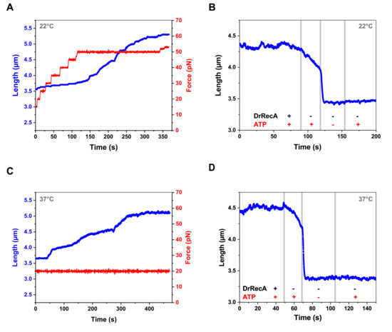 Considering that room temperature possibly is not a favorable condition for the proper assembly of DrRecA–dsDNA filaments [42,47], we further tested dsDNA–DrRecA interaction at a higher temperature of 37 °C and under lower Mg2+ ions concentration (1.5 mM MgCl2). Under these conditions, the DrRecA polymerization was less constrained and proceeded under a lower applied tension of 20 pN (Figure 3C). However, DrRecA–dsDNA filaments showed the same fast and complete disassembly upon ATP removal (Figure 3D), resulting in no change in the length of the tether upon reintroduction into the ATP-containing channel. Under both tested conditions, DrRecA–dsDNA filaments exhibited the length of 4.38 ± 0.21 µm (n = 22) at 3 pN in the presence of both DrRecA and ATP, indicating only a partial coverage of DNA.