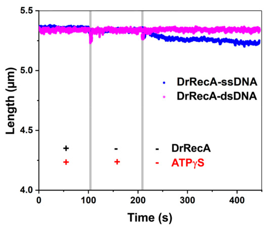 To further address the role of ATP hydrolysis in the observed behavior of the filaments on both ss- and dsDNA, we assembled DrRecA filaments in the presence of 1 mM ATPγS. Then, we followed the change in the filaments length during incubation and upon transitions between the channels containing respectively 1 µM DrRecA and 1 mM ATPγS, 1 mM ATPγS without DrRecA, and buffer without both DrRecA and ATPγS (Figure 4). The lengths of DrRecA–ssDNA and DrRecA–dsDNA filaments after assembly were close to each other: 5.34 ± 0.10 µm (n = 3) and 5.32 ± 0.04 µm (n = 4) respectively under applied tension of 3 pN. DrRecA filaments on both ss- and dsDNA exhibited great stability in the channel containing 1 mM ATPγS and no DrRecA. Transition to the channel lacking ATPγS did not lead to any compression of the filaments. However, subsequent incubation in the absence of ATPγS revealed a slow decline in the length of the DrRecA–ssDNA filament, whereas the length of the DrRecA filament formed on dsDNA was almost unchanged. This fact could be attributed to a very slow proceeding of DrRecA dissociation from ssDNA. Previously, a slow dissociation of EcRecA was reported from filaments formed in the presence of ATPγS on ssDNA but not dsDNA [37].