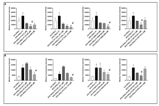 To evaluate the RTD cell redox status before and after antioxidant treatments, we performed a MitoSOX Red assay for selective detection of mitochondrial superoxide anions (O2 −) in iPSCs. MitoSOX fluorescence intensity was measured under basal conditions and after antioxidant supplementation to determine the optimal concentration for reduction of O2 − in RTD iPSCs. Of note, we determined the same optimal concentration for both RTD lines for riboflavin, coenzyme Q10, idebenone and EPI-743, whereas for AA, two different optimal concentrations were found and used for the two RTD iPSC lines (Figure 1).