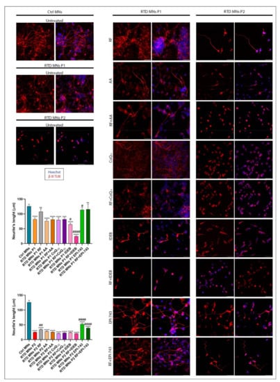 Analysis of neurite length following antioxidant treatment of MNs derived from RTD patient-derived iPSCs. Immunofluorescence images of β III tubulin (in red) show shorter neurites in RTD MNs compared to control cells. In both P1 and P2 RTD MNs, treatment with AA, CoQ10 and IDEB fails to cause significant changes. RF and EPI-743 ± RF causes improvement in neurite length for RTD MNs. Nuclei are counterstained with Hoechst (in blue). Scale bars = 50 μm. Data derived from four independent experiments, and values are expressed as mean ± SEM. According to Kruskal-Wallis test ** p < 0.01, *** p < 0.001, **** p < 0.0001, compared with control group (Ctrl); # p < 0.05, ## p < 0.01, ### p < 0.001, #### p < 0.0001 with respect to untreated RTD patient MNs.