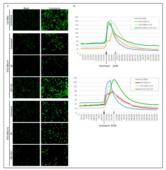 Intracellular calcium levels play a fundamental role in synaptic activity and in many other biological functions. Consequently, calcium imaging is used to quantify neuronal activity. It is known that control MNs functionally responded to calcium mobilization following ionomycin stimulation, and patient-derived MNs presented altered calcium homeostasis [49]. We confirmed that before ionomycin stimulation (basal conditions), the intracellular calcium levels were lower in both RTD MNs, and that even following ionomycin the maximal peak of intracellular calcium in RTD MNs was decreased compared to Ctrl MNs (Figure 4). Importantly, treatment with RF or EPI-743 considerably, increased intracellular calcium levels. However, despite RFs increasing the maximal intensity of RTD MNs to levels comparable to Ctrl MNs, the basal levels of calcium did not change following RF supplementation. The basal calcium levels of P1 RTD MNs, however, were restored to Ctrl levels following EPI-743 treatment without RF. These results support the notion that EPI-743 improves the intracellular calcium flow in RTD MNs compared to untreated MNs, and that this effect is stronger compared to that observed with RF treatment.