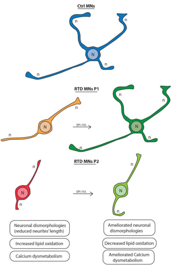 Schemae showing the morphological changes of the RTD MNs before and following treatment with EPI-743. The drawing depicts neurons with short neurites in RTD P1 and P2, but following EPI-743 treatment they extend longer neurites that, for RTD P2, are very similar to Ctrl MNs, while, for RTD P1 neurite length is improved but still not comparable to that of Ctrl MNs. N = Nucleus. n = neurite.