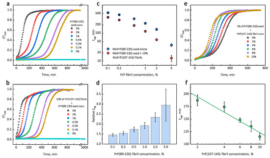 Representative curves of PrP-seed-induced aggregation reaction kinetics performed in the absence (a) or presence (b) of PrP(107-143) fibrils. Logarithmic plot of values of seed-induced aggregation reaction performed in the absence and presence of 10% of PrP(107-143) fibrils (c). Relative values (ratio between in the absence and presence of 10% peptide fibrils) (d). Dependence of PrP(89-230)-seed-induced aggregation reaction kinetics on the initial concentration of PrP(107-143) fibrils (e,f). Error bars are standard deviations (n = 9).