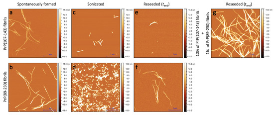 AFM images of PrP(107-143) and PrP(89-230) aggregates. Images of the spontaneously formed PrP(107-143) (a) and PrP(89-230) (b) aggregates. Images of sonicated PrP(107-143) (c) and PrP(89-230) (d) aggregates. Images of aggregates formed during PrP(107-143)-fibril-induced (e) or PrP(89-230)-seed-induced (f) aggregation reaction. Image of aggregates formed in the presence of both PrP(107-143)-fibrils and PrP(89-230)-seed (g).