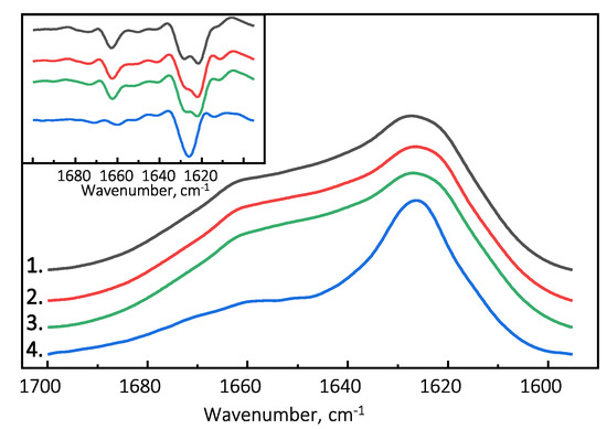 Absorbance and second derivative (inset) FTIR spectra of PrP(89-230) and PrP(107-143) fibrils. 1.—Spontaneously formed PrP(89-230) fibrils. 2.—Fibrils formed in the presence of 1% of PrP(89-230) fibrils. 3.—Fibrils formed in the presence of 10% of PrP(107-143) fibrils and 1% of PrP(89-230) fibrils. 4.—Spontaneously formed PrP(107-143) fibrils.