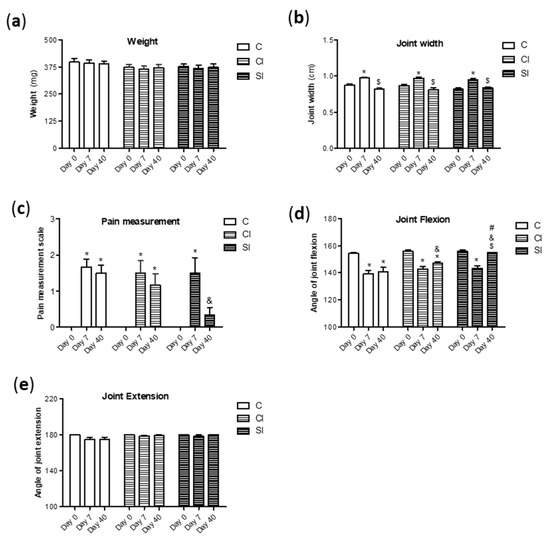 Macroscopic and clinical evaluation. Macroscopic evaluation of the animals from the experimental groups (under non-treatment (C); intraarticular injection of saline (CI) or H2S donor (SI)) was performed. Firstly, the weight (a) and articular diameter (b) were monitored. Evaluation of the pain levels (c) was performed with an arbitrary scale, as previously indicated. Finally, the angle of joint flexion (d) and extension (e) over the course of the model were assessed by a protractor. Values are mean ± SEM (n = 6 independent animals for each condition). * p ≤ 0.05 vs. day 0; $ p ≤ 0.05 vs. day 7; & p ≤ 0.05 vs. the respective day in the control group; # p ≤ 0.05 vs. the respective day in the CI group.