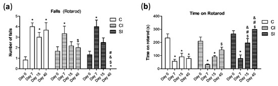 All the animals were subject to a Rotarod performed test (Ugo Basile S L, Varese, Italy) at days 0 (before surgery), 7, 15m and 40 after a training period of 2 weeks. Briefly, the rats were placed on a cylinder (rod) rotating at 30 rpm for 300 s and forced to move. Then, the number of falls during this period was registered, as well as the time that the rats stayed on the Rotarod before the first fall.