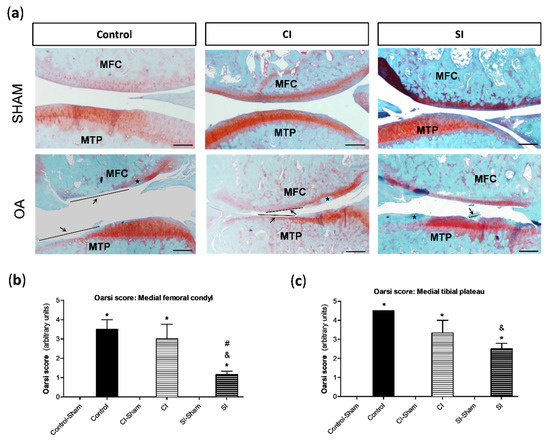 Histological analysis of articular cartilage. Cartilage lesions were evaluated by the semi-quantitative modified osteoarthritis Research Society International (OARSI) score, as previously indicated in the Materials and Methods section. (a) Representative images of the joint sections stained with Safranin-O-fast green from each group of the study, showing the cartilage of the medial compartment from the tibial plateau (MTP) and femoral condyle (MFC) in the right knee (sham surgery) and left knee (OA surgery). Arrows indicate areas with a loss of cartilage matrix and ★ indicates cartilage with the loss of Safranin staining (indicator of proteoglycan content). Analysis of the semi-quantitative score of the pathological alterations in the cartilage from MFC (b) and MTP (c). Values are mean ± SEM (n = 3 independent animals for each condition). * p ≤ 0.05 vs. the respective sham-operated joint; & p ≤ 0.05 vs. the C group; # p ≤ 0.05 vs. the CI group. Control, non-treated; CI, control injection; SI, H2S donor injection. Scale bar = 500 µm.