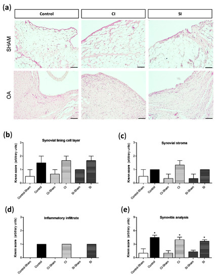 Histological analysis of synovial tissue. Pathological responses in the synovial tissue were evaluated by a semi-quantitative Krenn score, as previously indicated in the Materials and Methods section. (a) Representative images of synovial sections stained with hematoxylin and eosin from each group of the study, showing synovium in the medial compartment of the right knee (sham surgery) and left knee (OA surgery). Analysis of the semi-quantitative score of the following pathological alterations in the synovial tissue: number of lining cell layers (b), proliferation of the subintima tissue (c), and infiltration of inflammatory cells (d). (e) The sum up of the pathological changes in the tissue is shown. Values are mean ± SEM (n = 3 independent animals for each condition). * p ≤ 0.05 vs. the respective sham-operated joint. Control, non-treated; CI, control injection; SI, H2S donor injection. Scale bar = 50 µm.