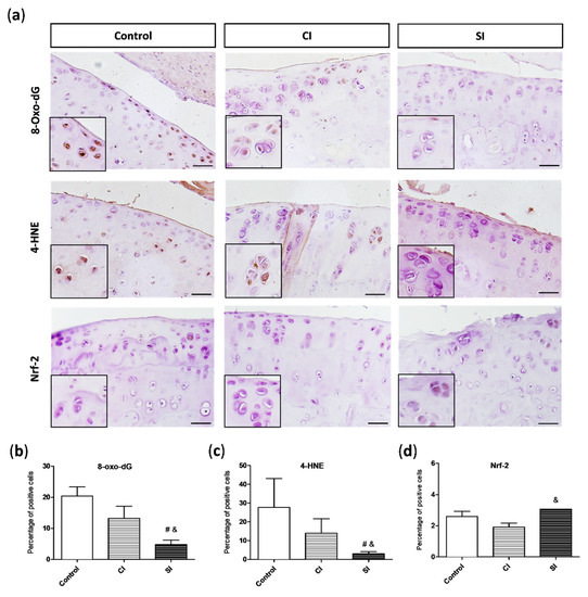 Presence of oxidative damage markers and antioxidant response in the articular cartilage. (a) Representative images of 8-hydroxy-2′-deoxyguanosine (8-oxo-dG), 4-hydroxy-2-nonenal (4-HNE), and nuclear factor erythroid-derived 2-like 2 (Nrf-2) immunohistochemistry in the cartilage from each group of the study. Magnification (2x) of the images are shown on its bottom-left corner. Quantitative analysis of 8-oxo-dG (b), 4-HNE (c), and Nrf-2 (d)-positive cells. Values are mean ± SEM (n = 3 independent animals for each condition). & p ≤ 0.05 vs. the C group; # p ≤ 0.05 vs. the CI group. Control, non-treated; CI, control injection; SI, H2S donor injection. Scale bar = 20 µm.