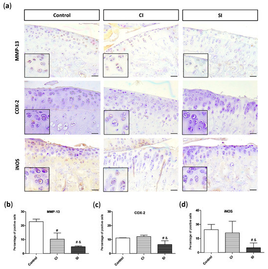 Presence of pro-catabolic mediators in the articular cartilage. (a) Representative images of metalloproteinase-13 (MMP-13), inducible nitric oxide synthase (iNOS), and cyclooxygenase 2 (COX-2) immunohistochemistry in the cartilage from each group of study. Magnifications (2x) of the images are shown on their bottom-left corners. Quantitative analysis of MMP-13 (b), iNOS (c), and COX-2 (d)-positive cells. Values are mean ± SEM (n = 3 independent animals for each condition). & p ≤ 0.05 vs. the C group; # p ≤ 0.05 vs. the CI group. Control, non-treated; CI, control injection; SI, H2S donor injection. Scale bar = 50 µm.
