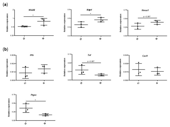 Measurement of the gene expression of antioxidant and pro-inflammatory markers. Relative expression levels of genes involved in antioxidant response (a) (nuclear factor erythroid-derived 2-like 2 (Nfe2l2), nicotinamide adenine dinucleotide phosphate hydrogen (NADPH):quinone oxidoreductase (Nqo1), and heme oxygenase-1 (Hmox1)) and in pro-inflammatory signaling (b) (interleukin-1β (Il1b), tumor necrosis factor-α (Tnf), cytokine-induced neutrophil chemoattractant-1 (Cxcl1), cyclooxygenase 2 (Ptgse)) were analyzed in blood samples from each group of the study, as previously indicated. Values are mean ± SEM (n = 3 independent animals for each condition). * p ≤ 0.05 vs. the CI group. CI, control injection; SI, H2S donor injection.