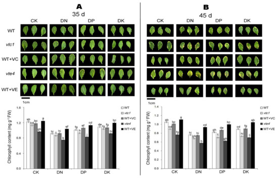 Leaf phenotypes and chlorophyll contents of Arabidopsis thaliana at the 35th day (A) and the 45th day (B) after germination. CK, DN, DP, DK represent normal, deficiency of nitrogen, deficiency of phosphorus, and deficiency of potassium treatments, respectively. vtc1 and vte4 are vitamin C and vitamin E synthetic deletion mutants, respectively. WT+VC and WT+VE represent treatments of 5 mM exogenous vitamin C and vitamin E, respectively, to the wild-type (WT) plants. Bar = 1 cm. FW, fresh weight. The data represent average values ± SEM (n = 3). Different small letters show significant differences (p < 0.05).