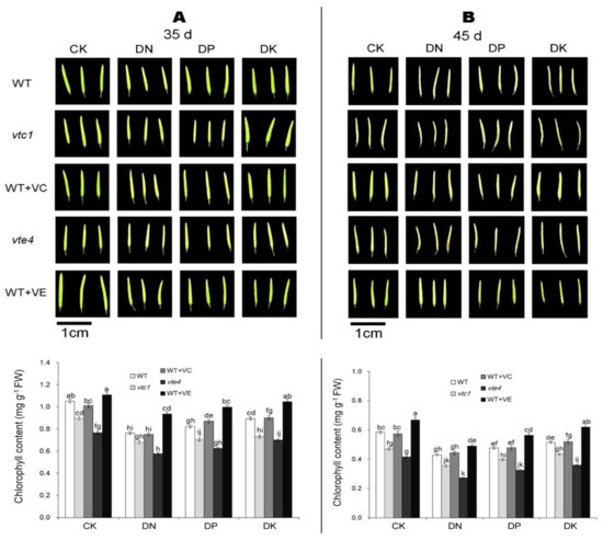 After 20 days of macro-element deficiency (the 45th day), the senescence was further aggravated (Figure 1B and Figure 2B). Similar to the 10 days of deficiency of macro-elements, the degree of leaf yellowing in each treatment was DN>DP>DK>CK. Different from the result obtained after 10 days, after a longer period of stress, the leaves and seeds of vtc1 turned yellow and the chlorophyll was degraded. Although the vitamin E and vitamin C synthetic-deficient mutants vte4 and vtc1, respectively, had more severe stress than WT; an exogenous addition of vitamin E can only alleviate the stress caused by the deficiency of macro-elements (Figure 1A and Figure 2A).