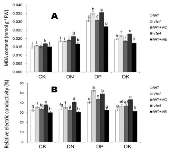 After 20 days of macro-element deficiency, the content of malondialdehyde (MDA) in Arabidopsis under DN, DP, DK treatments was significantly higher than that under CK conditions. Under DP treatment, the MDA content was the highest, followed by DP and DK treatments. The vte4 was most affected by the deficiency of macro-elements where the MDA content was the highest. Adding exogenous vitamin E effectively alleviated the oxidative damage caused by the stress, which is evident by the decrease in MDA content and electric conductivity (Figure 3).