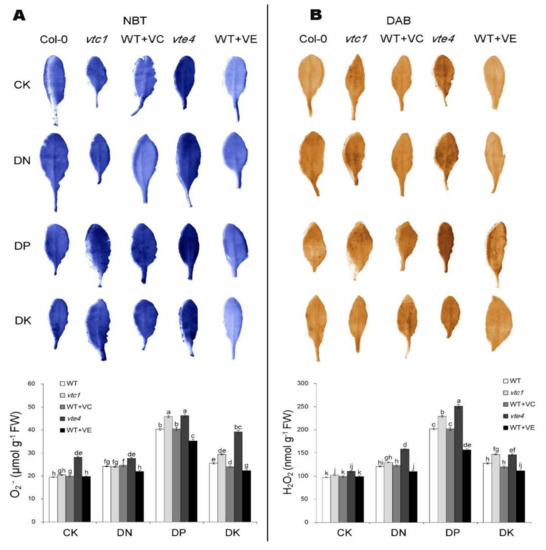 To more intuitively reflect the oxidative damage caused by the deficiency of macro-elements, we selected Arabidopsis leaves after 20 days of macro-element deficiency treatment. The selected leaves were measured for the production levels of two major ROS species, H2O2 and O2Ȓ, under macro-elements deficiency stress, by histochemical staining using nitro-blue tetrazolium (NBT) and 3,3’-diamino-benzidine (DAB), respectively (Figure 4). The vte4 mutant had the highest accumulation of H2O2 and O2− with the most severe oxidative damage, and after the addition of exogenous vitamin E, the ROS level became lower than the WT (Figure 4).