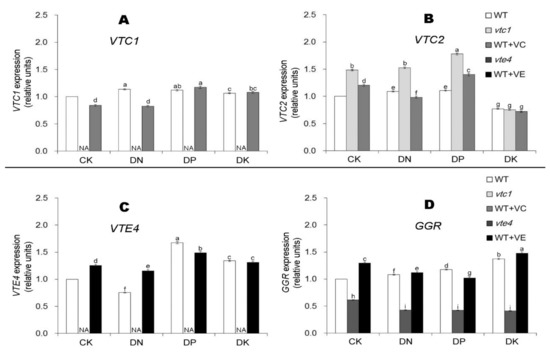 Vitamin E and vitamin C, as antioxidants, can remove ROS in plants and relieve the damage caused by oxidative stress. In vtc1 mutant, the expression of VTC2 is induced. Adding exogenous vitamin C inhibited the expression of VTC1 under CK and DN conditions and induced the expression of VTC1 and VTC2 under DP and DK conditions (Figure 5A,B). In vte4, the expression of GGR was significantly inhibited and the expression was significantly lower than that of the WT. Under CK, DN, and DK conditions, adding exogenous vitamin E induced the expression of VTE4 and GGR. In contrast, under DP conditions, adding exogenous vitamin E inhibited the expression of VTE4 and GGR (Figure 5C,D).