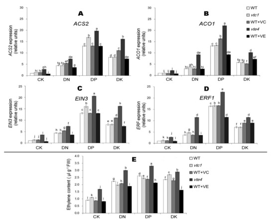 An ethylene-signaling mutant ein3 delayed the water stress-related increase in vitamin E and resulted in a 30% reduction in the levels of antioxidants, compared with the wild-type [55]. While an over-produced ethylene mutant, eto1-1, showed a 5-fold increase in vitamin E contents during leaf aging [55]. Thus, the perception and signal transduction of ETH may be involved in the regulation of vitamin E biosynthesis. On the contrary, here we showed that exogenous vitamin E repressed ethylene synthetic gene and ethylene-signaling gene expression, which might be attributed into its strong antioxidant capacity (see Discussion below).