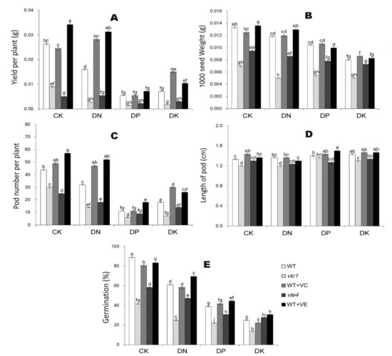 The Arabidopsis was cultivated for 21 days and treated with DN, DP, and DK treatment, and samples were taken after the seeds were mature. Arabidopsis under DP conditions had the lowest yield, followed by DK, and DN. The yield in vtc1 and vte4 was lower than that in the WT, while adding exogenous vitamin C and vitamin E significantly increased the yield, and vitamin E had a more potent effect on increasing production (Figure 8A). The results showed that the seed weight DK<DP<DN<CK (Figure 8B), the number of seed pods per plant DP<DK<DN<CK (Figure 8C), and the length of seed pods had no effect on the yield (Figure 8D). The Arabidopsis seeds under the different treatments were counted, and it was found that the germination rate of the seeds is related to their growth status before harvest. Seed germination rate was DK<DP<DN<CK, and the seed germination rate of vtc1 and vte4 was significantly lower than WT, and adding exogenous vitamin C and vitamin E did not change the germination rate of seeds significantly (Figure 8E).