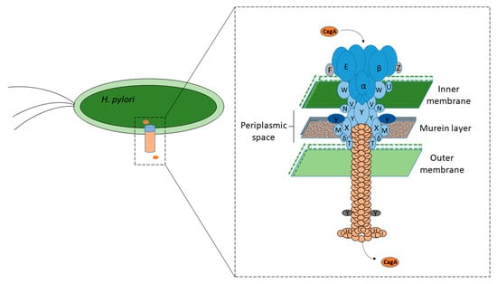 - Backert, S.; Tegtmeyer, N.; Fischer, W. Composition, structure and function of the Helicobacter pylori cag pathogenicity island encoded type IV secretion system. Future Microbiol. 2015, 10, 955–965. [Google Scholar] [CrossRef]