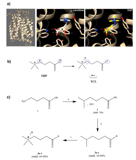 (A) Binding modes of l-carnitine (white sticks) THP (yellow sticks) resulting from docking simulations. Residues involved in protein‒ligand interactions are drawn as balls and sticks; the receptor hOCTN2 is reported in tan ribbons; (B) structural modifications carried out on THP; (C) synthesis of TCL 4a–t. (a) HCOH 37%, HCOOH, 60 °C, 16 h; (b) for 3a-j and 3l-t: amine, DCC, HOBT, Et3N, CH2Cl2, or THF, RT, 24 h, for 3k: 4-nitroaniline, PCl3, pyridine, 3 h, 40 °C; (c) CH3I, acetone, 18 h, RT. Abbreviations: 3-(2,2,2-trimethylhydrazine)propionate, THP; THP structurally related compounds, TCL; hydroxymethylene, HCOH; formic acid, HCOOH; N,N’- dicyclohexylcarbodiimide, DCC; hydroxybenzotriazole, HOBT; N,N-diethylethanamine, Et3N; dichloromethane, CH2Cl2; tetrahydrofurane, THF; room temperature, RT; phosphorus trichloride, iodomethane, PCl3.