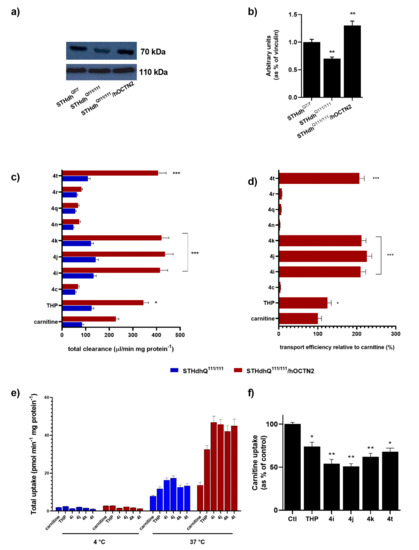 Finally, carnitine uptake by cultured STHdhQ111/111 was significantly inhibited by TCL substrates, including 4i, 4j, and 4k (p < 0.01), and, to a lesser extent, by 4t and THP (p < 0.05) (Figure 2f). Accordingly, 4i, 4j, 4k, and 4t were chosen for the subsequent experiments.