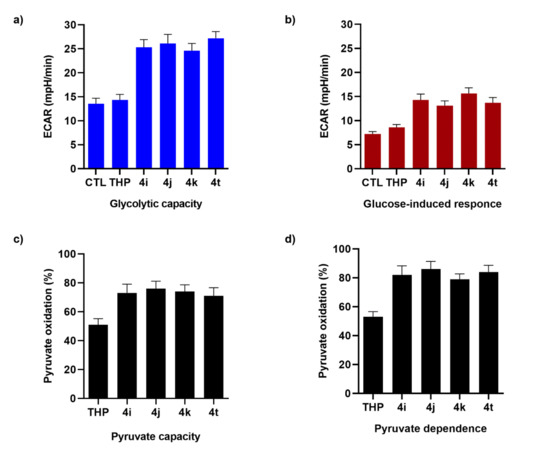 To understand if selected TCL were able to reprogram STHdhQ111/111 to use glycolytic metabolites as an alternative fuel, the STHdhQ111/111 energetic metabolism was evaluated in the presence of TCL. STHdhQ111/111 treatment with TCL (4i, 4j, 4k, and 4t) significantly increased both the glycolytic capacity and glucose-induced response, while THP treatment resulted in a non-significant increase in the extracellular acidification rate (ECAR) (Figure 3a). The oxygen consumption rate (OCR) of cultured STHdhQ111/111 demonstrated the cellular dependence on pyruvate to fuel mitochondrial respiration and the capacity for utilizing this substrate when the others (i.e., FA and glutamine) are blocked (Figure 3b). The reliance of untreated STHdhQ111/111 on pyruvate to fuel oxygen consumption was lower. The treatment with TCL had a very strong impact on the STHdhQ111/111 mitochondrial dependence on pyruvate importation into the mitochondria and the capacity for import when fatty acid oxidation and glutaminolysis were both inhibited (Figure 3c,d).