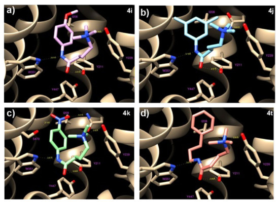 The binding modes of the different ligands tested, resulting from docking simulations. The receptor hOCTN2 is depicted by tan ribbons, and all the ligands are sticks. The residues involved in protein‒ligand interactions are drawn as shapes and sticks. (a,b) The binding mode for 4i (pink sticks) and 4j (light blue sticks); 4k is in green in (c); (d) molecule 4t is shown in orange.