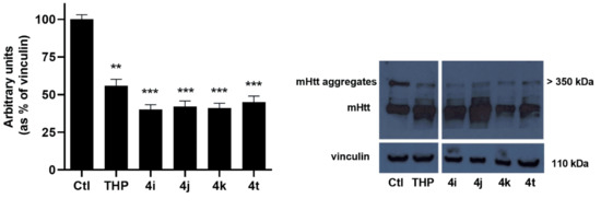 Representative western blot of mHtt aggregates in the STHdhQ111/111 cell line incubated for 72 h in the presence of of 50 μM 4i, 4j, 4k, or 4t. Densitometric quantification was performed on three different experiments, and the results are expressed as the mean of the values obtained (mean ± SD). ** p < 0.01 and *** p < 0.001 versus control.