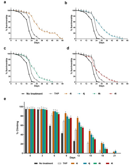 In addition, the influence of these molecules on the locomotion of the flies was assessed, as a parameter of improved health. Due to damaged motor neuronal function, the HD flies showed progressive movement disorders that can be evaluated by the climbing test, which takes advantage of the natural tendency of flies to climb a vial wall. Our results indicate that all four THP-derived molecules significantly ameliorated the climbing ability of transgenic flies (Figure 6e). For all the molecules, motor dysfunction appeared later, with a higher percentage of flies that achieved the target (10 s) over time with respect to the THP-treated flies (p < 0.001). In terms of lifespan, better results were obtained after treatment with 4i and 4j as shown in Figure 6e.