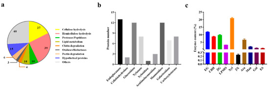 By using the label free quantitative proteomic approach, a total of 154 proteins were identified in the T. harzianum EM0925 secretome, which were common in all the three biological replicates. The predicted proteins in the secretome of T. harzianum EM0925 were grouped according to their biological function annotated in Pfam and dbCAN database. The 81 detected CAZymes contained 27 cellulases covering a complete cellulolytic enzyme system with 13 endoglucanases (GH5, GH7, GH16, GH17, GH30, GH55, GH64, GH81), 2 cellobiohydrolases (GH6, GH7), and 12 glucosidases (GH3, GH15, GH16, GH55) (Figure 2a, Figure S1). The detection of 39 hemicellulases revealed that this kind of enzymes was more abundant than the cellulases in T. harzianum EM0925 secretome, which included 8 xylanases (GH11, GH30), 1 xylosidases (GH3), 3 arabinofuranosidases (GH54, GH127), 7 galactosidases (GH2, GH22, GH27, GH30), 11 mannosidases (GH2, GH47, GH92, GH125), 1 mananase (GH26), and 8 carboxylesterases (CE1, CE5, CE10) (Figure 2b, Figure S1).