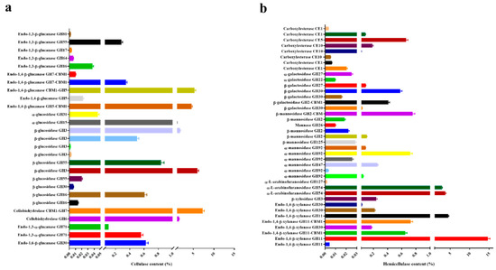 Cellulase and hemicellulase abundance in the proteome of T. harzianum EM0925. (a) Cellulase content in the proteome of T. harzianum EM0925; (b) hemicellulase content in the proteome of T. harzianum EM0925.
